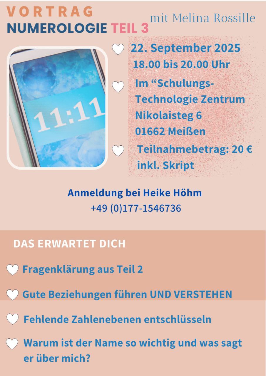 22 September @ 18:00 – 20:00 Vortrag Numerologie Teil 3 mit Melina Rossille VVeG Meißen Schulungszentrum Oehmstr . 1, Dresden €20
